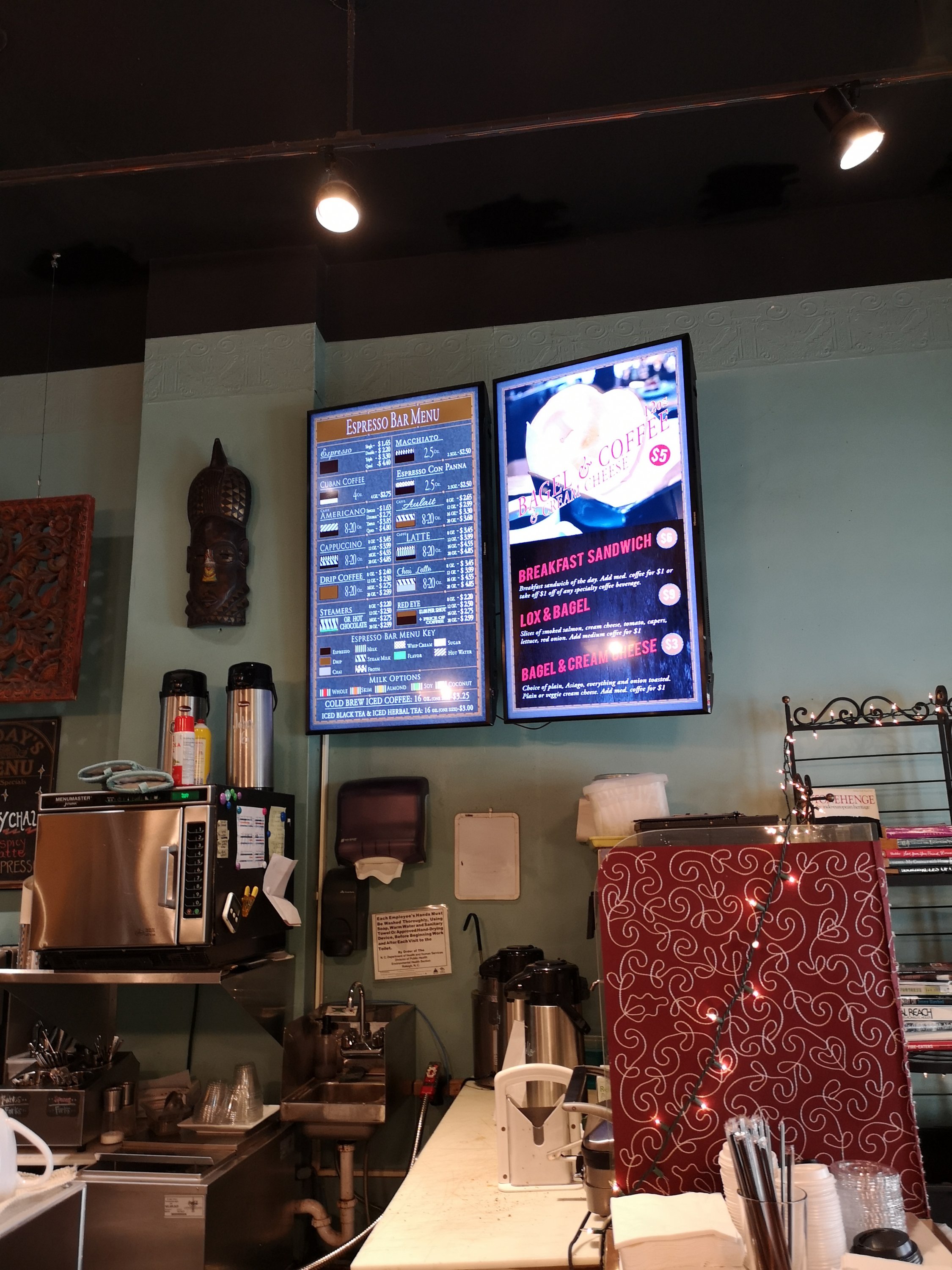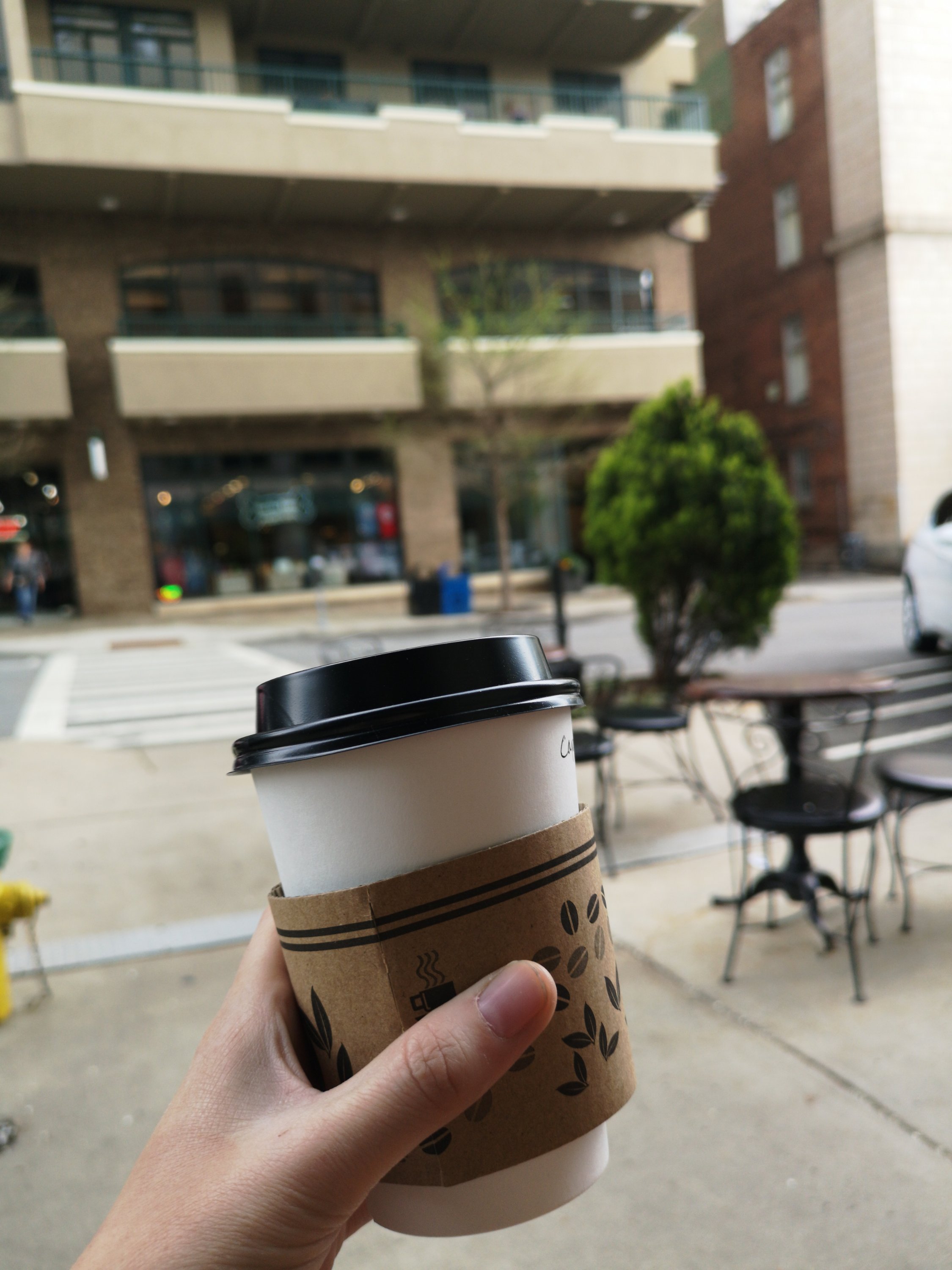 Bij een lokale koffiebar halen we eerst een bakje koffie.
