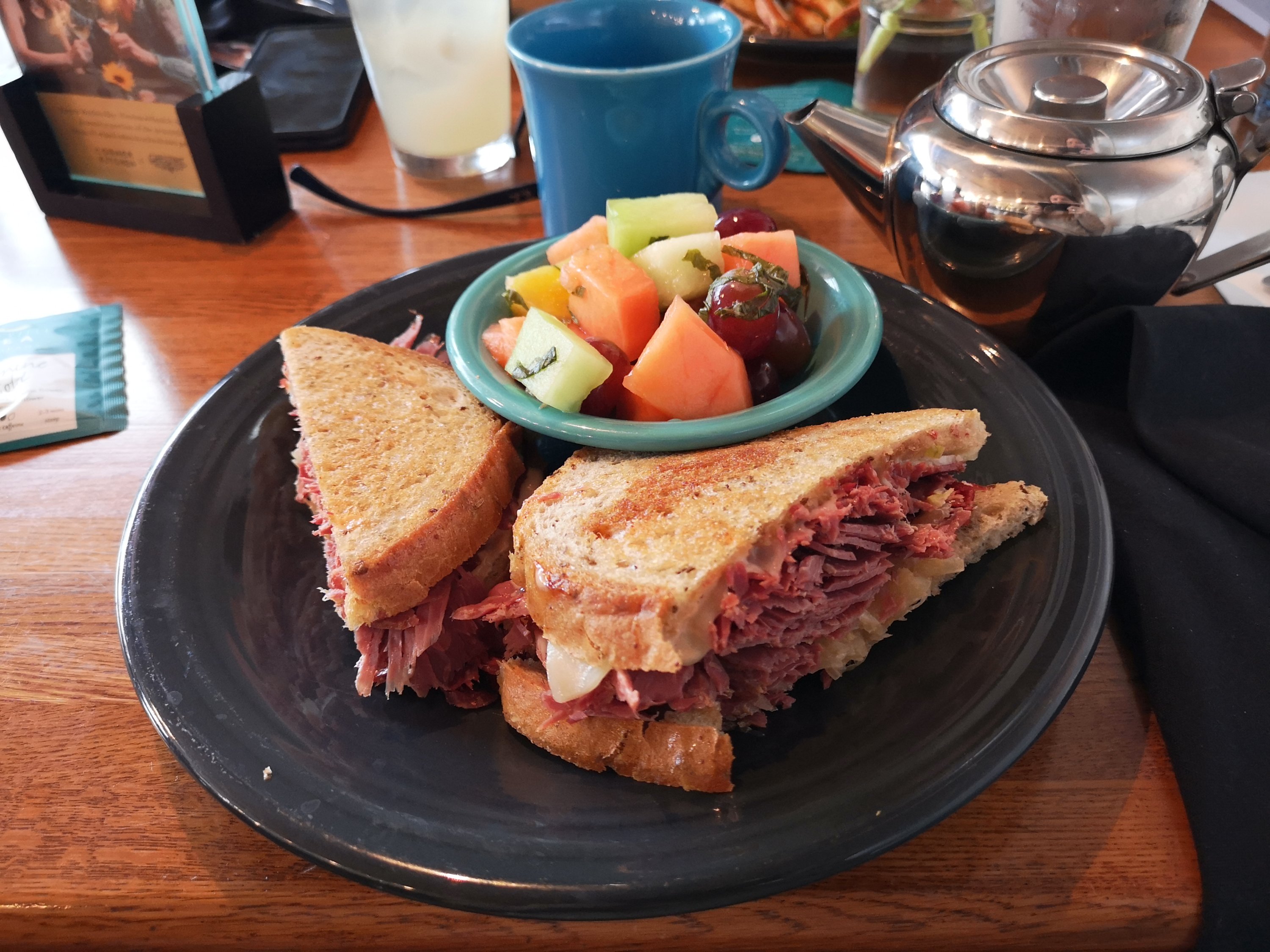 Een lunch bij Corner Kitchen, een reuben sandwich met sauerkraut en 1000 Island dressing. Superlekker. En wat fruit erbij om gezond te doen.
