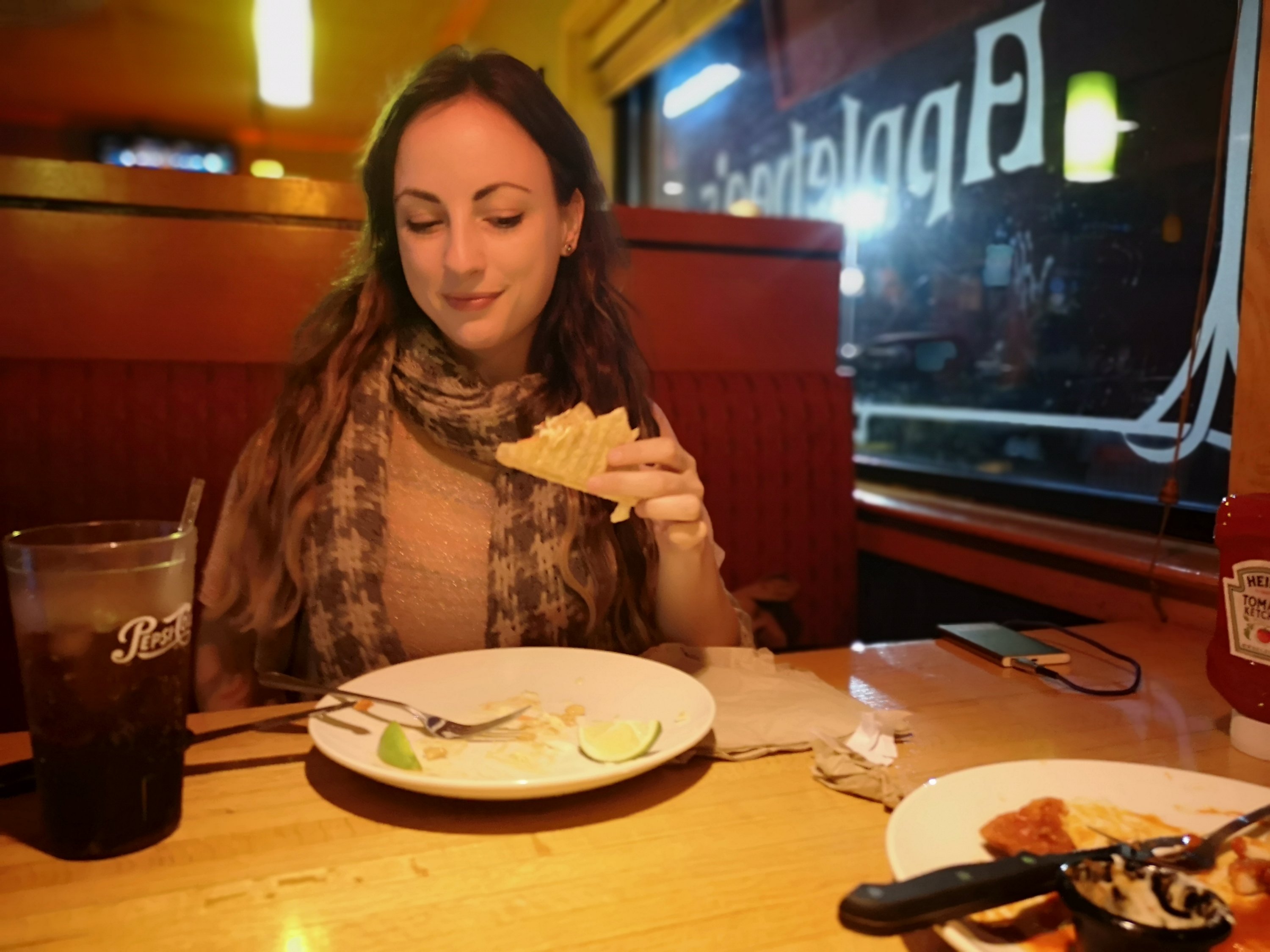 Na wat gedoe met de kamer rijden we naar een dorp verderop om bij Applebee’s te eten.