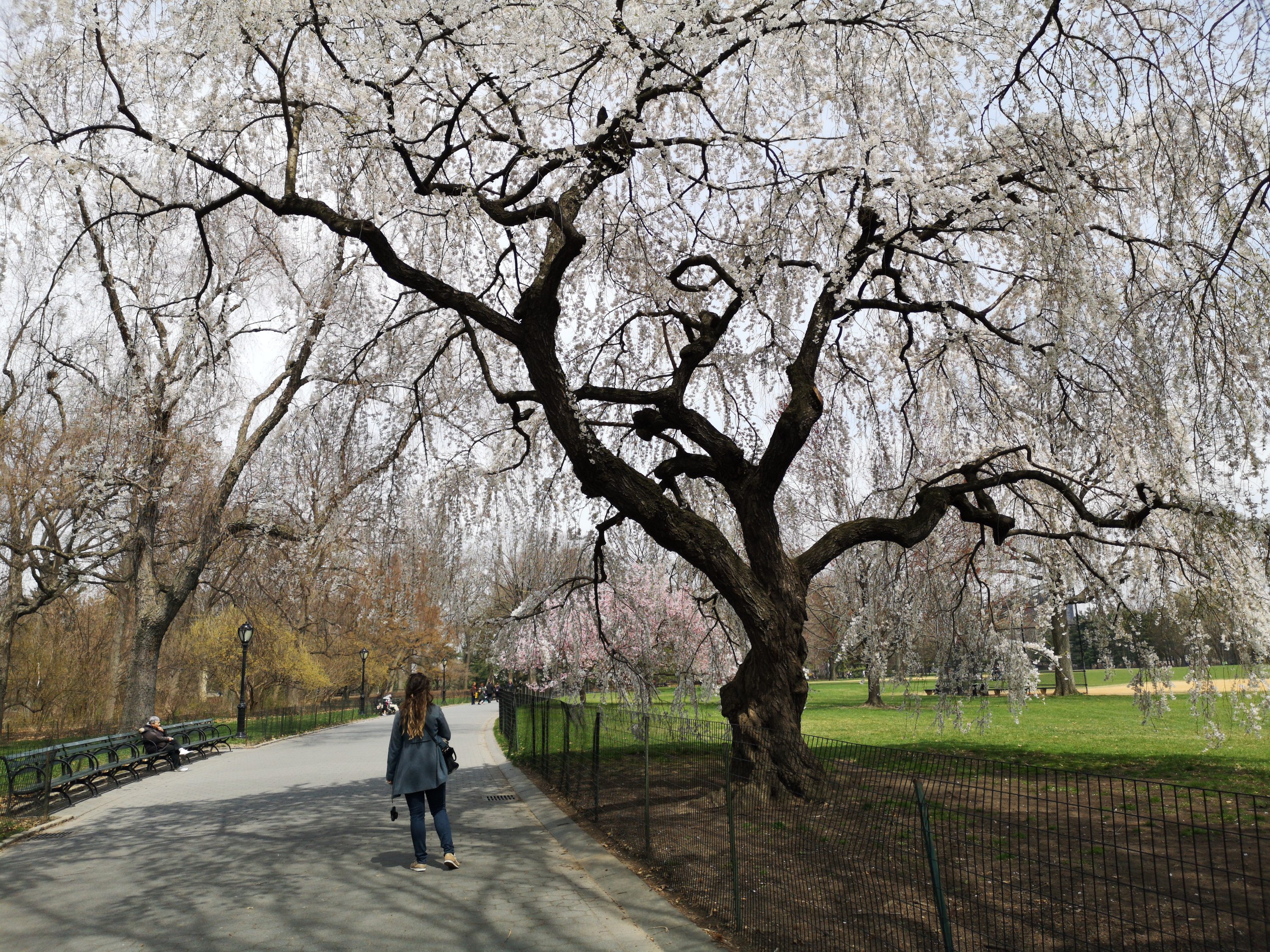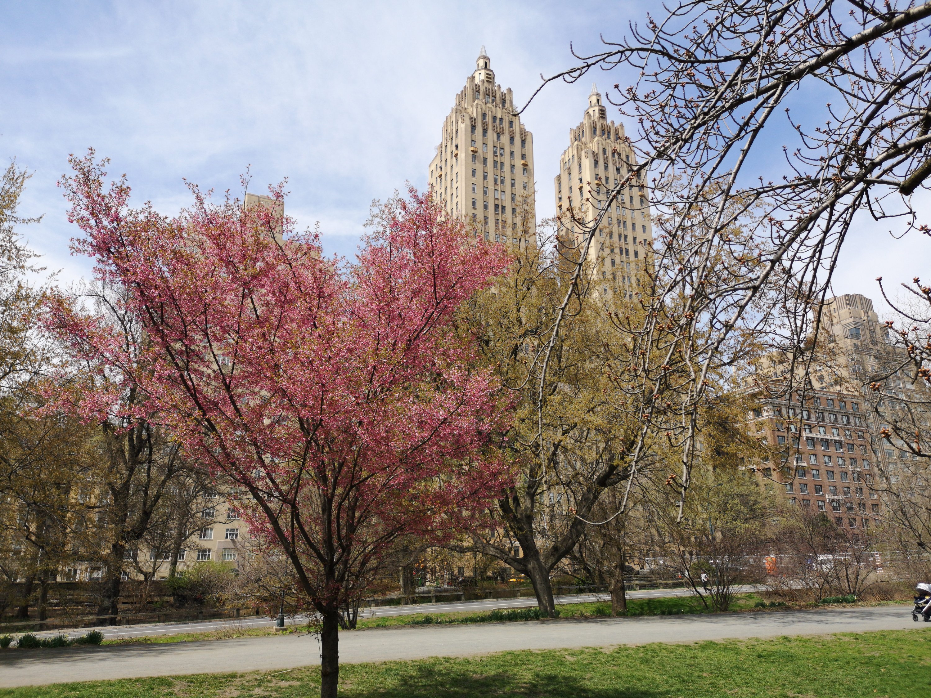 We wandelen door Central Park, maar helaas zien we geen wasberen. Wel allerlei lentekleuren.