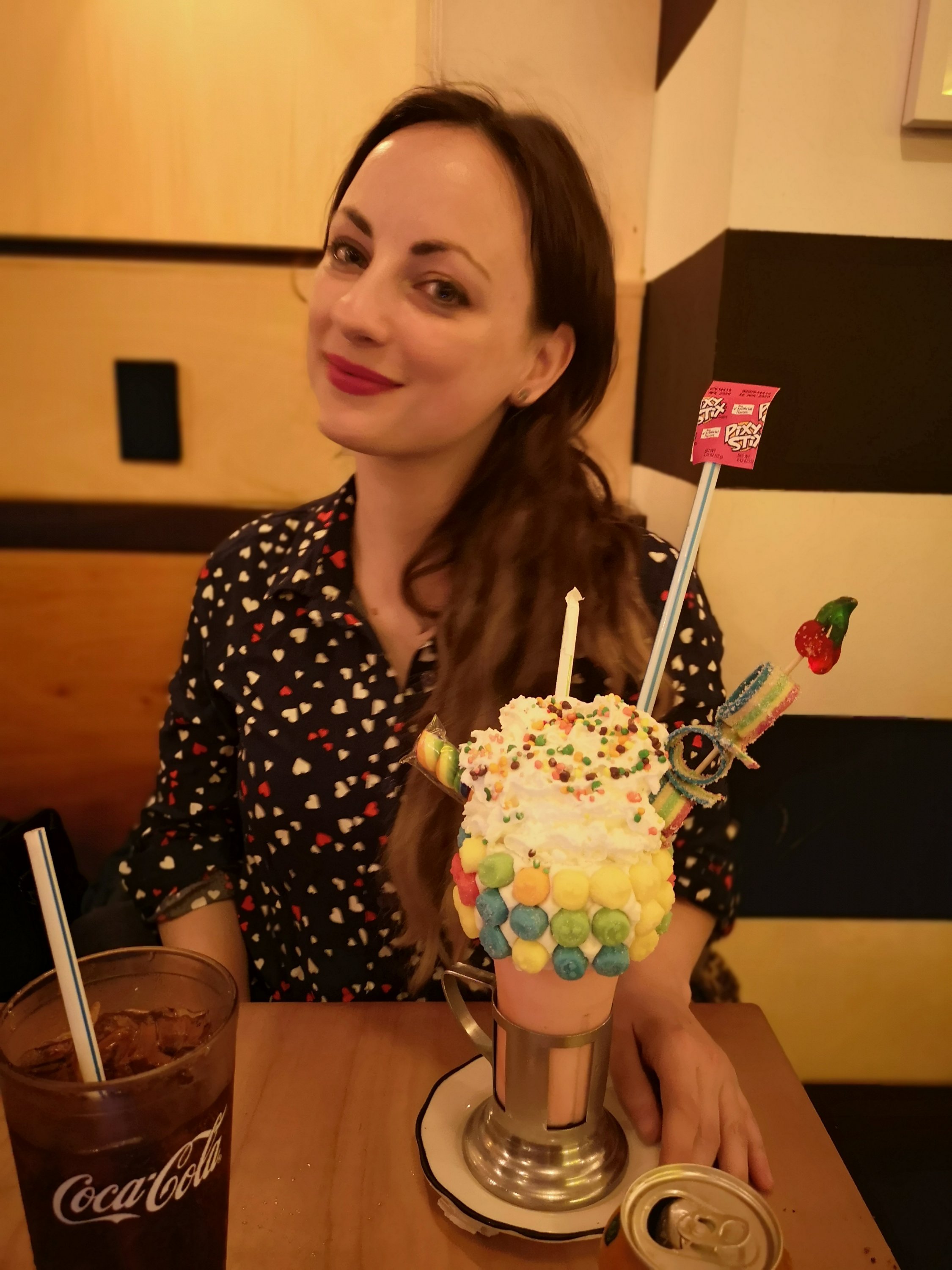 In wilde altijd al eens een bezoek brengen aan Black Tap met de Crazy Shakes. En zelfs ’s avonds laat moesten we nog eventjes wachten, maar even later had ik een enorme milkshake met kersensmaak en snoep voor me.