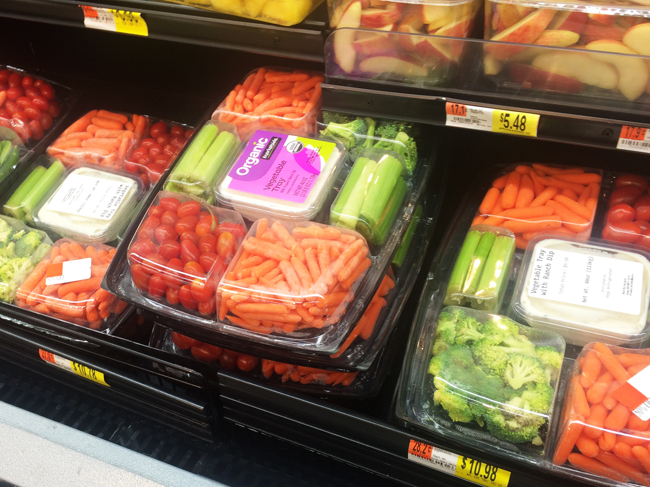 Nog geen zin in eten kocht ik maar bananen, een los broodje en een bakje groente/fruit bij de Walmart. In dat bakje zaten appelpartjes, wortels, nootjes en kaas. Het lijkt een beetje hierop maar dan veel kleiner.