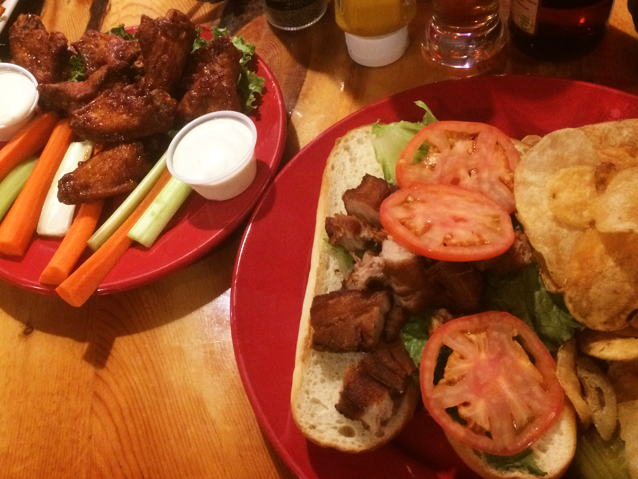 Als voorafje namen we chicken wings en hier krijg je meestal selderij en wortels bij. Lekker met ranch saus! Verder at ik een broodje pork belly, met chips…