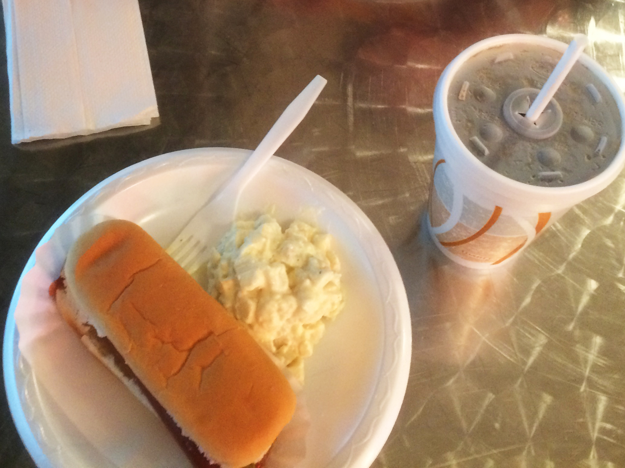 Tussen de middag aten we bij de Devils Tower Trading Post een hotdog, terwijl we schuilden voor het onweer. Inclusief aardappel salade en cola met een vreemd smaakje.