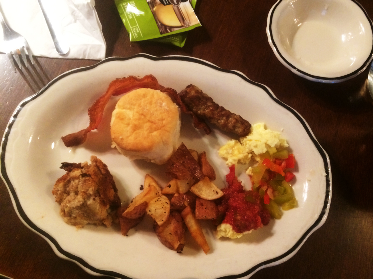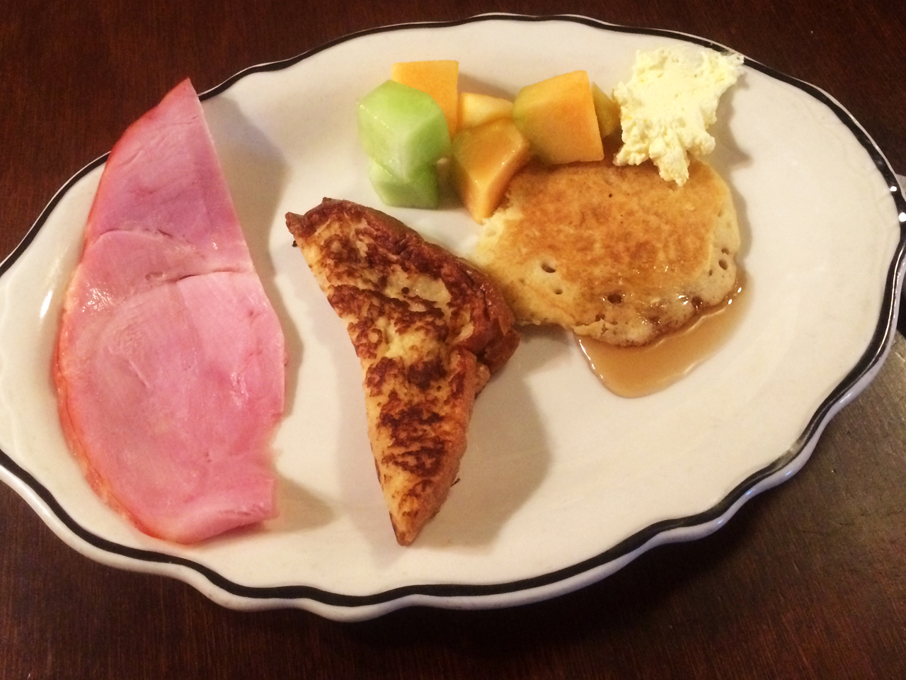 Maar er waren ook hartige dingen zoals worst, bacon, ham en aardappel. Lekker met een kopje groene thee, want dat is gelukkig steeds vaker verkrijgbaar in Amerika. Je moet er wel altijd ‘hot’ bij zeggen als je thee bestelt, want anders krijg je icetea.