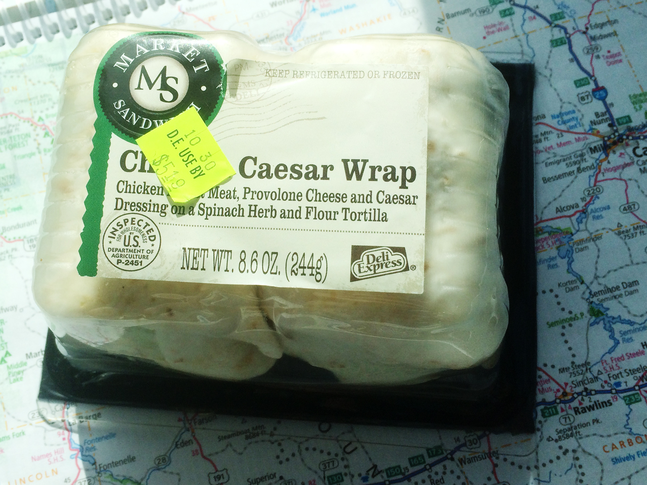 Tijdens deze lange reisdag at ik een Caesar wrap in de auto. Vers uit een tankstation. Niet heel erg lekker.