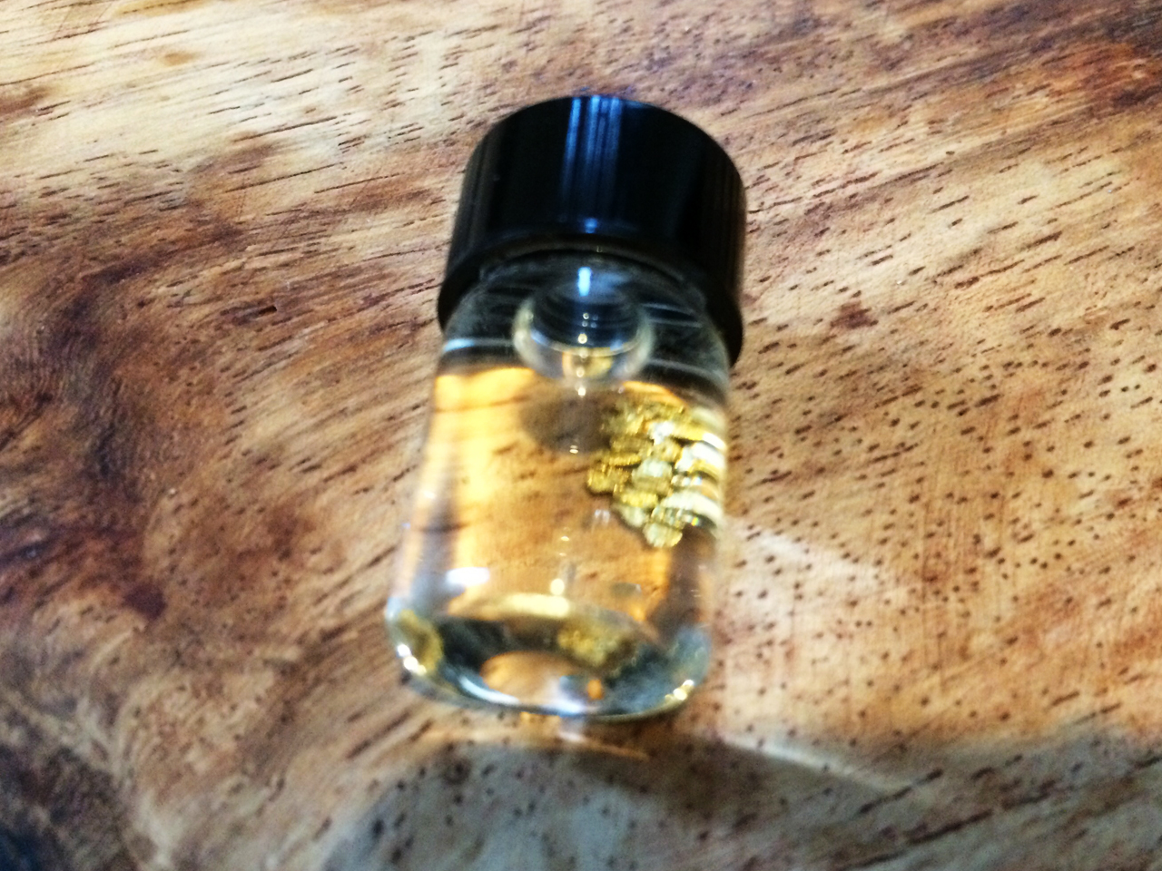 Uiteindelijk hadden we een goudpan over met veel zand. Randy liet zien hoe je die pan in het water zeeft, zodat het zand verdwijnt en uiteindelijk alleen het goud achterblijft. De buit ging in een klein glazen flesje en zo konden we eens goed bekijken wat we verzameld hadden.