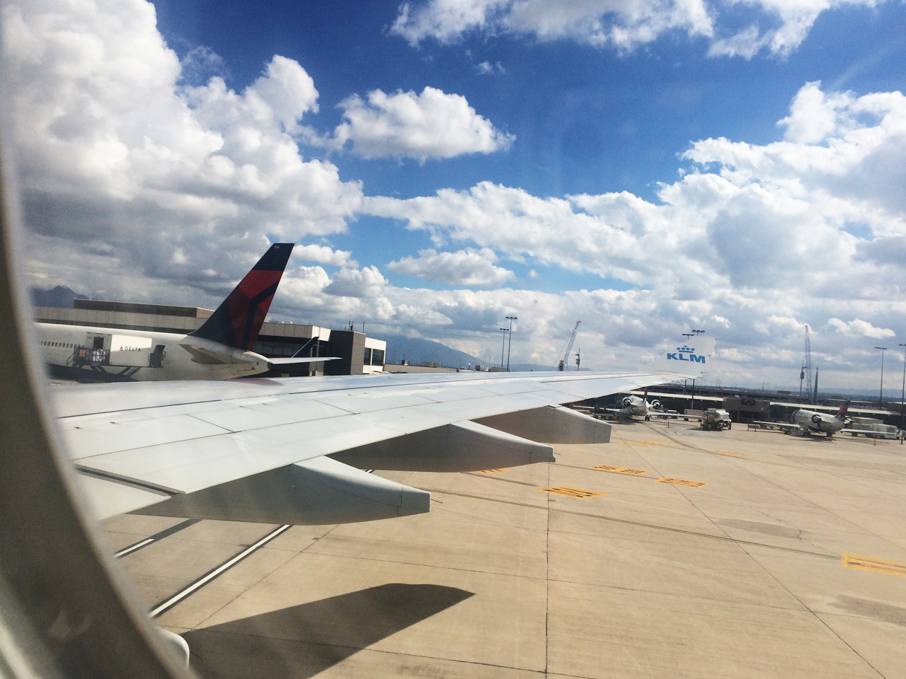 Eindelijk durf ik weer naar buiten te kijken, want we staan op de grond. We zijn in Salt Lake City. En wauw, opeens zijn er bergen!
