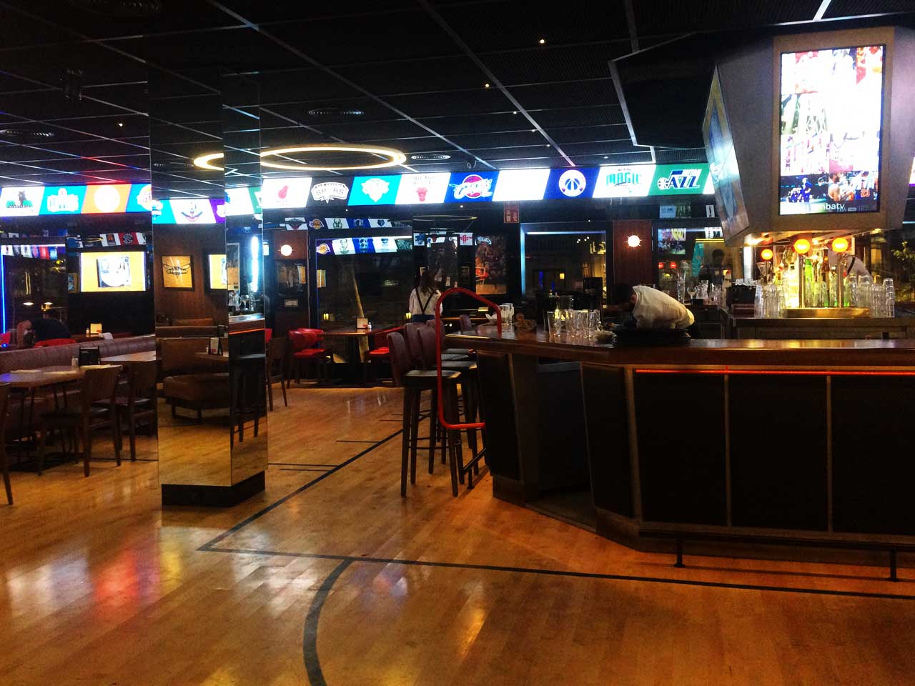 Een bar, comfortabele banken, tafeltjes lang het raam met uitzicht op de Ramblas en overal zicht op grote tv schermen waar live basketbalwedstrijden worden uitgezonden. Aan de muur hangen items die van bekende basketbalspelers zijn geweest.
