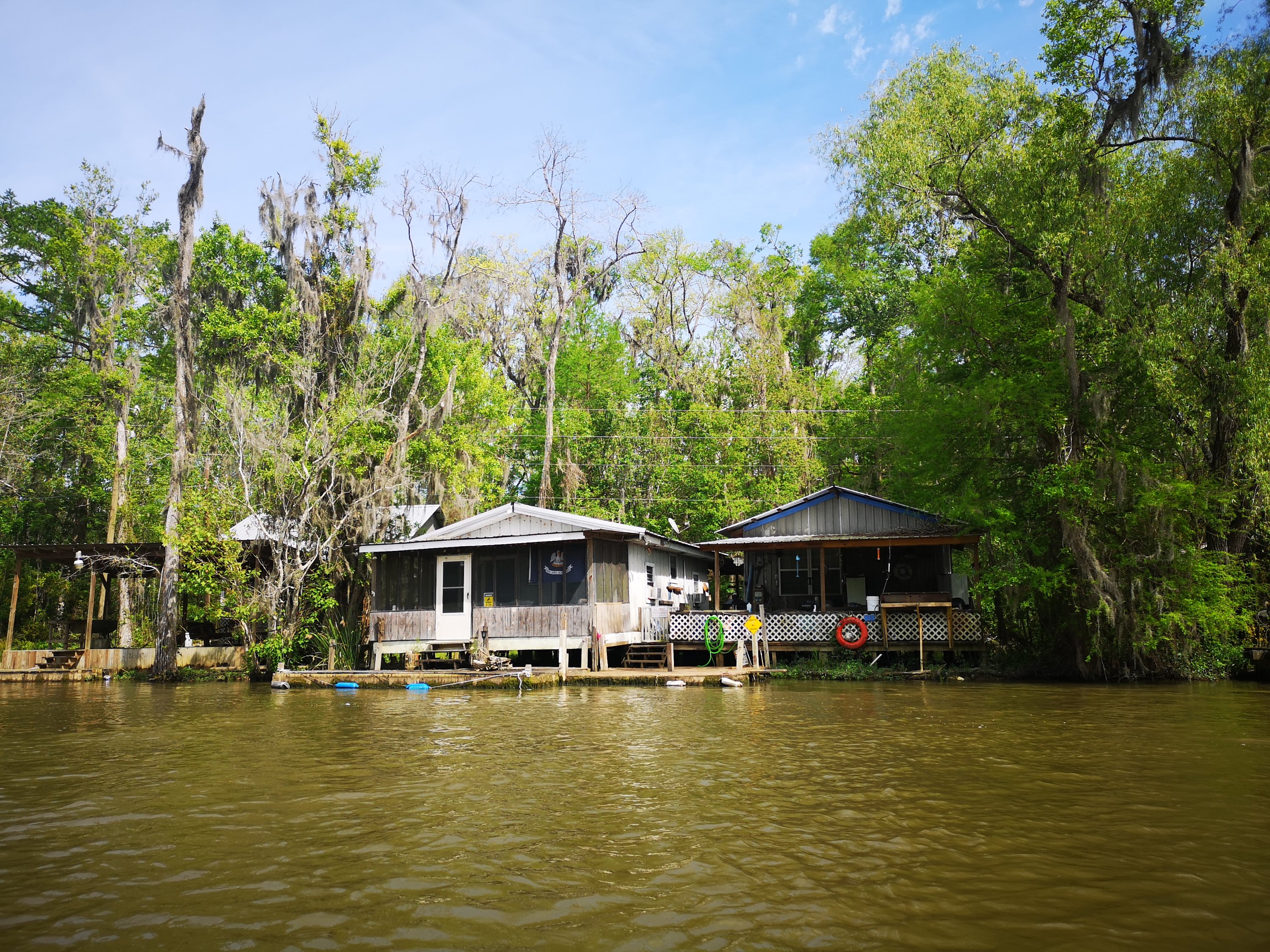We varen langs huisjes aan het water. Sommigen zijn verwoest door orkaan Katrina.