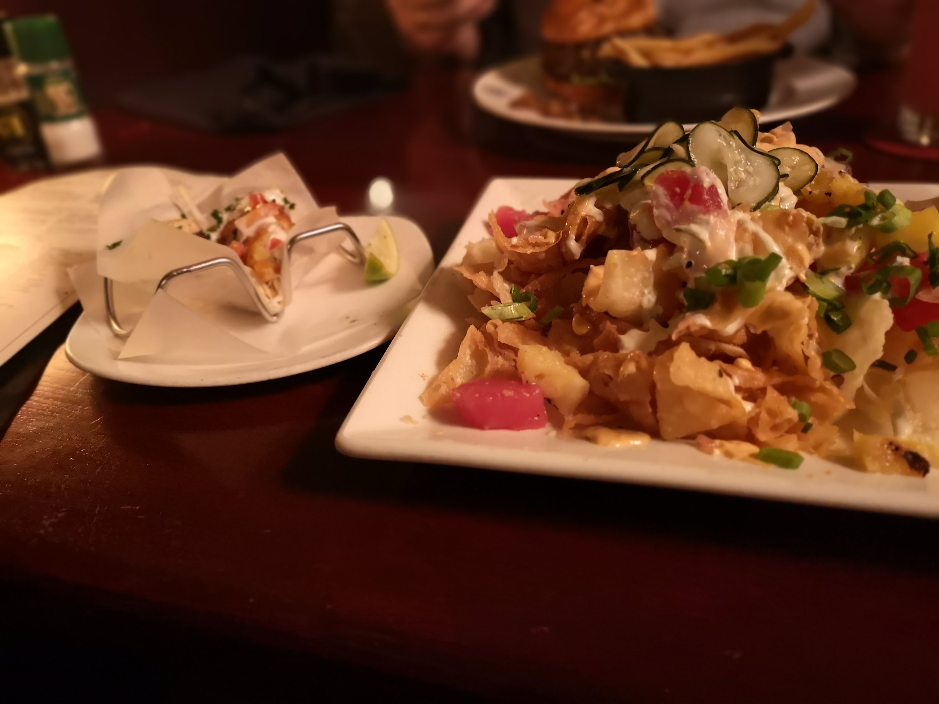S avonds eten we bij een brouwerij. Tuna nacho’s, een vistaco en een cocktail en bier.