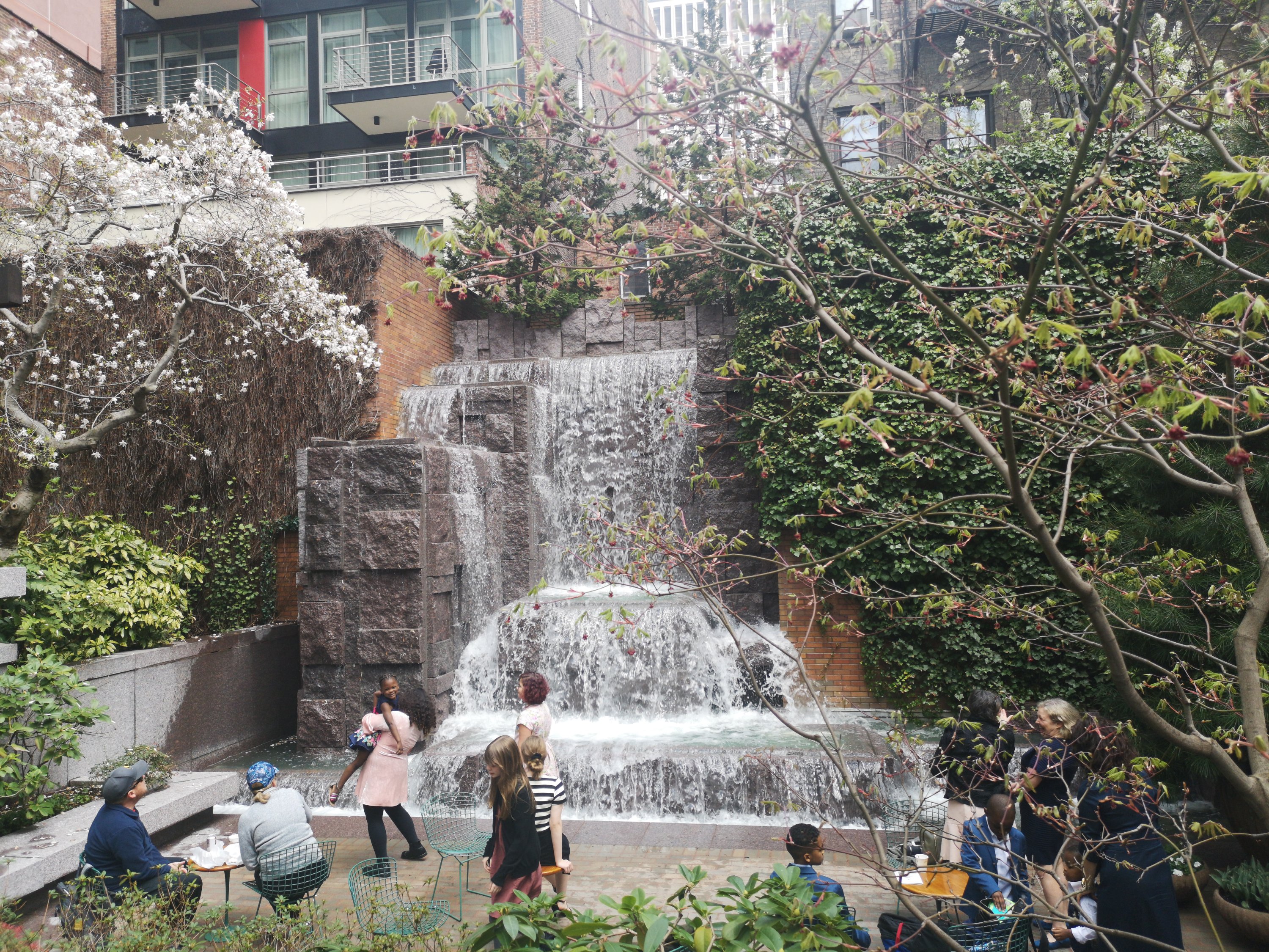 Daarna lopen we via het drukke 5th avenue naar Greenacre Park, een klein hofje middenin de stad met een waterval.