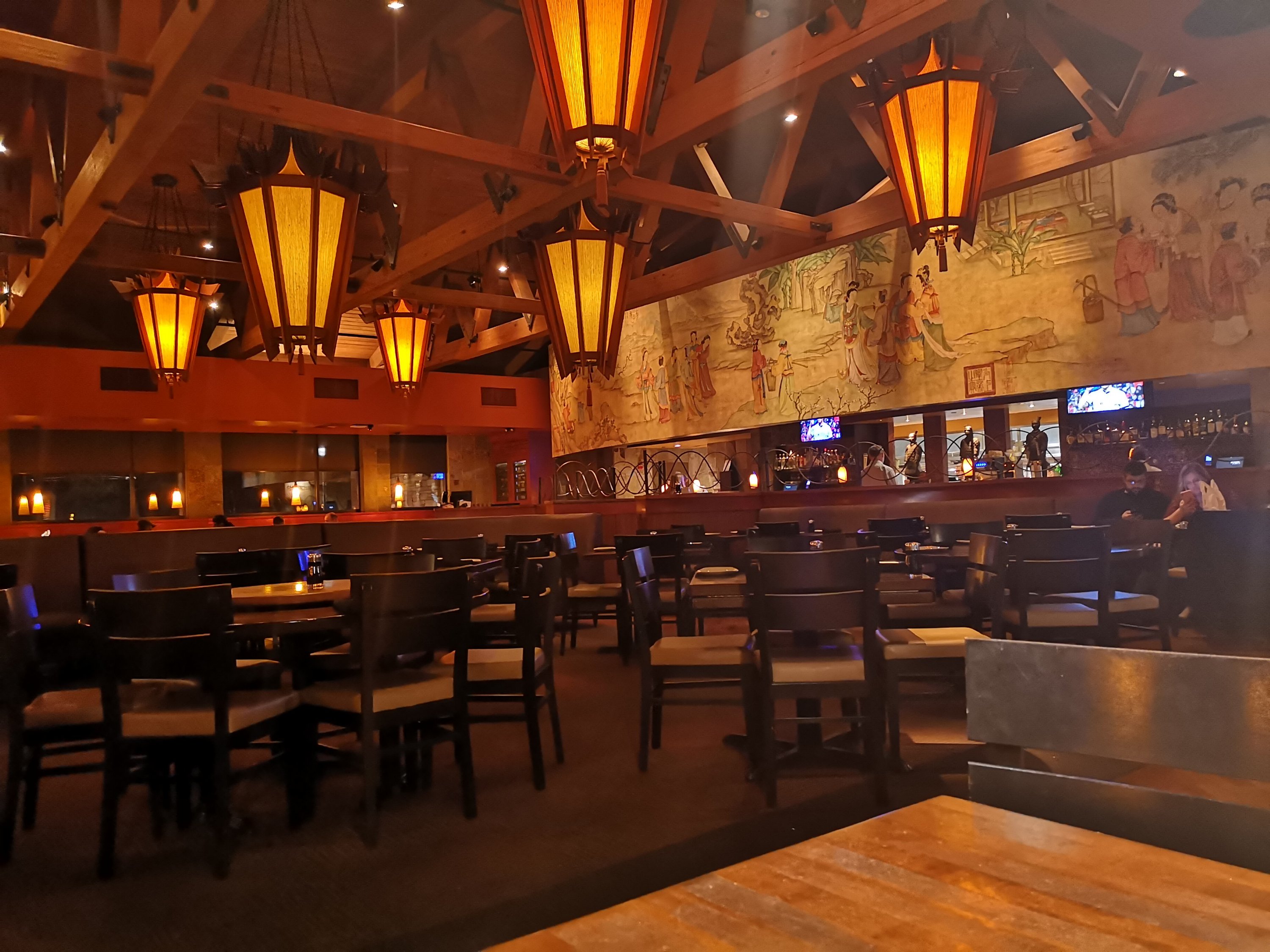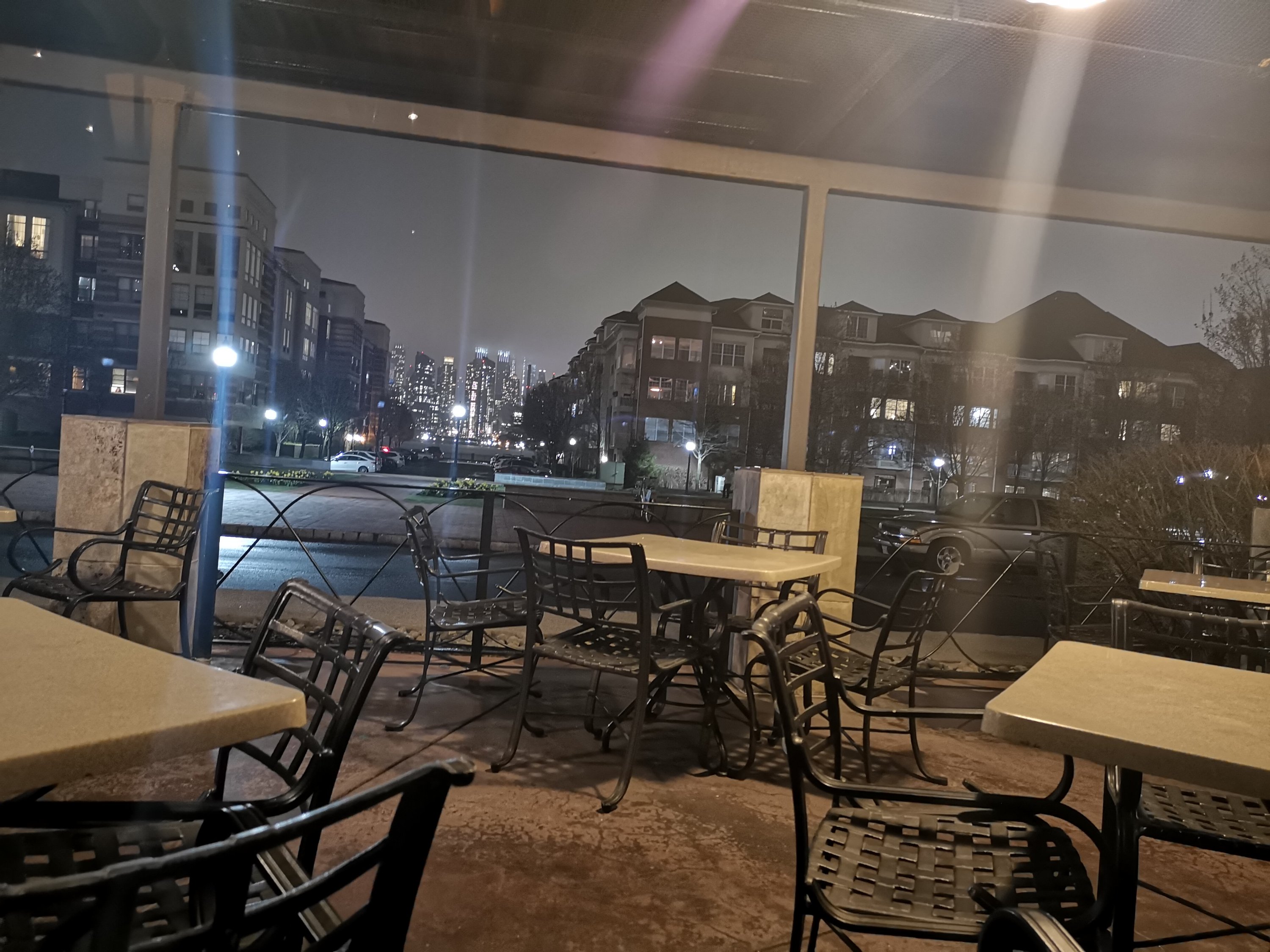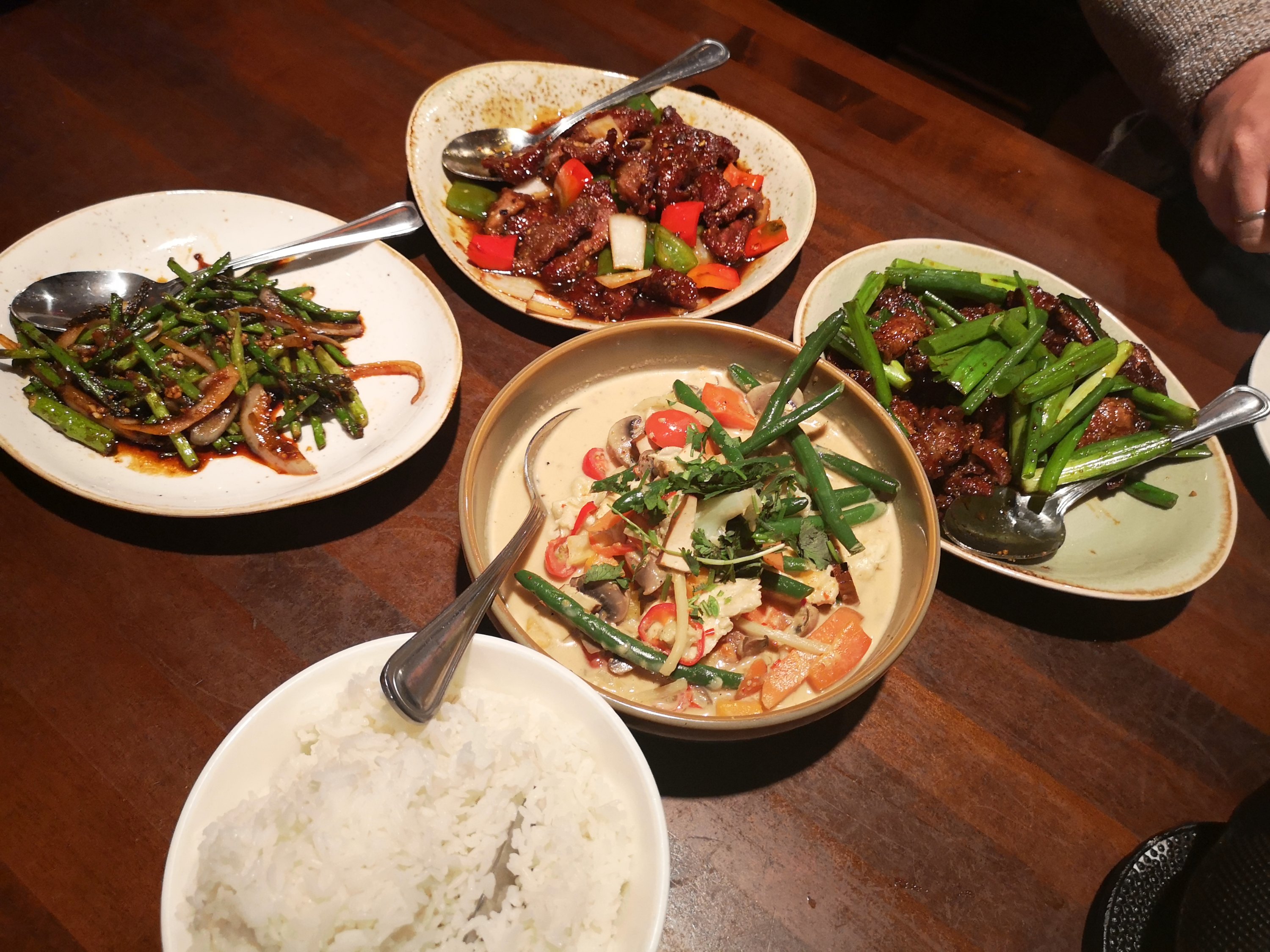 We eten bij PF Chang’s in Weehawken. Vanuit het restaurant kun je de hoogbouw van New York ook een beetje zien.