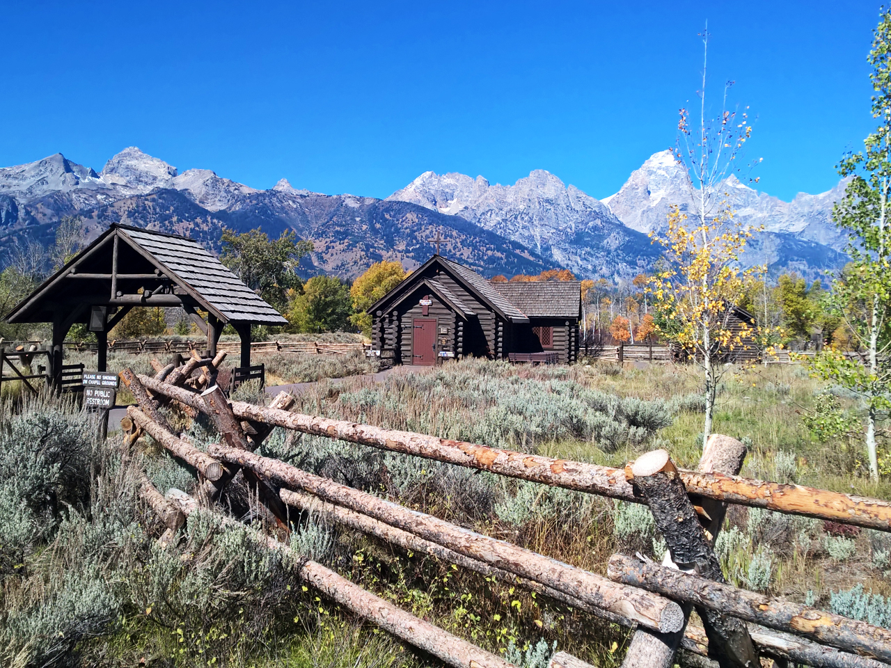 Bijvoorbeeld een oud kerkje. The Chapel of the Transfiguration uit 1925, met het Tetongebergte op de achtergrond.