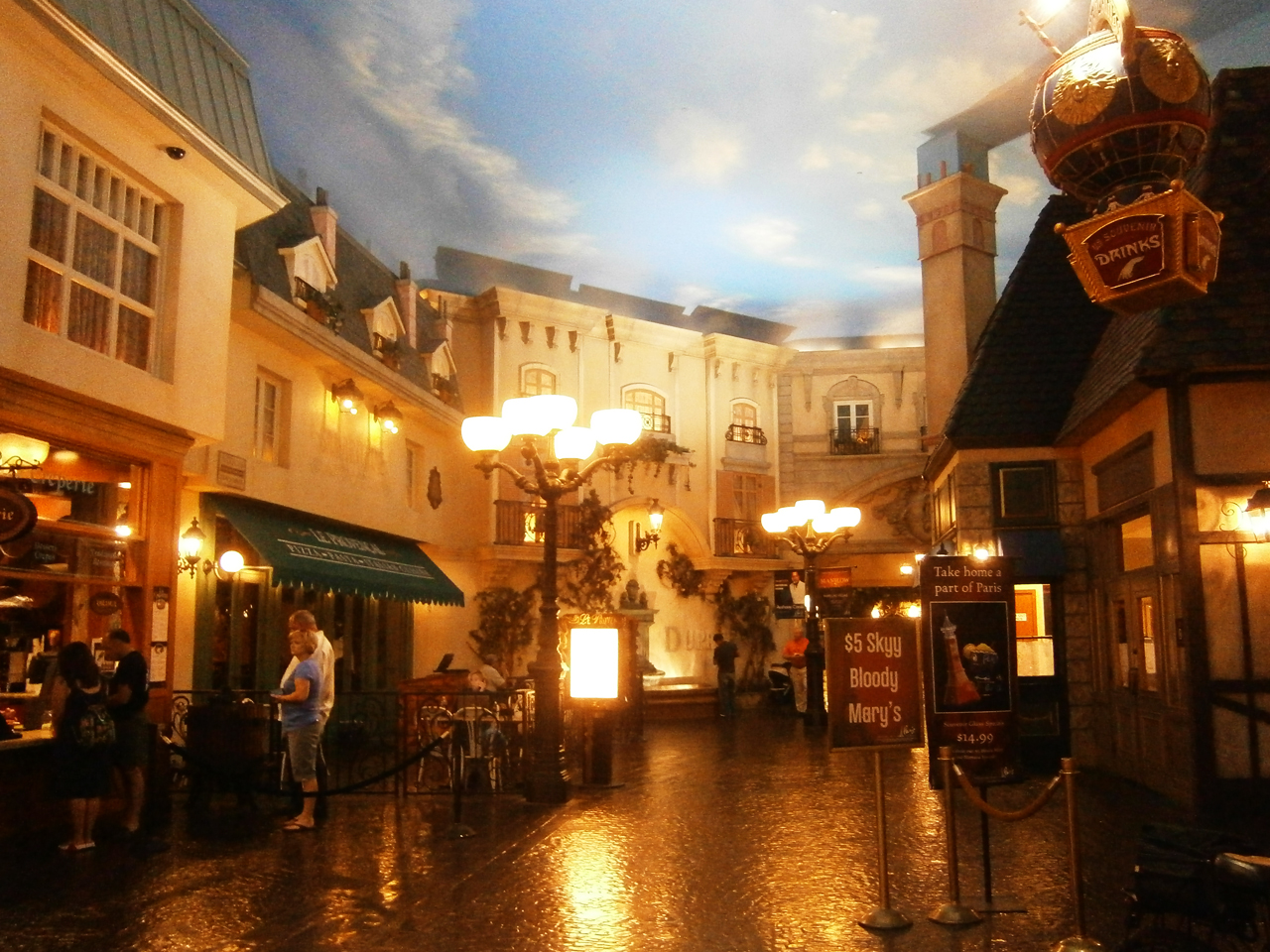 Aangezien we gisteren de buffetpas hebben gekocht, gaan we ontbijten bij een van de deelnemende hotels. Het wordt het Paris hotel. Dit is een prachtig hotel om te bezoeken. Herkenbaar aan de Eiffeltoren die voor de deur staat. In het hotel zijn de straten van Parijs nagemaakt en er is ook een gezellig buffetrestaurant. We gaan zitten aan een tafeltje en het lijkt door de geveltjes van Franse huisjes, de blauwe lucht en de echte musjes, alsof we niet langer in de USA zijn. We zijn er voor het ontbijt, maar dit gaat net over in de lunch, we kunnen dus ook voor wat stevigere, warme gerechten kiezen. En natuurlijk is er enorm veel keuze.