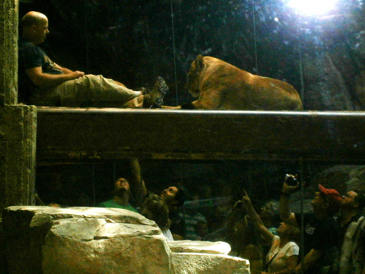 Als bezoeker kun je onder het glas doorlopen waar de leeuwen op liggen.Verderop houden mensen om de beurt een heel klein babyleeuwtje op schoot.