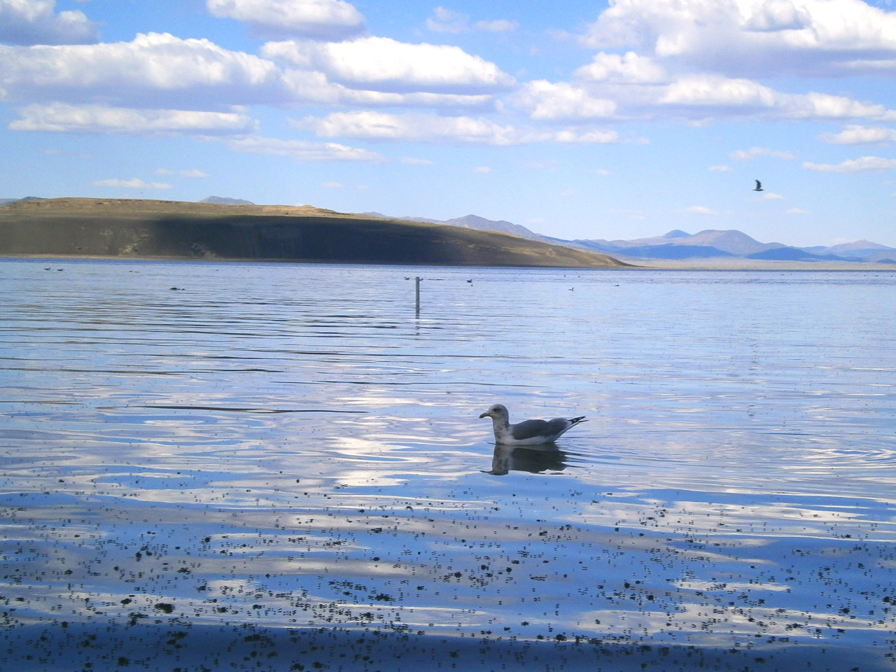 Voor de terugweg nemen we wel de goede route, we hoeven nu maar een paar mile over het slechte wegdek. De tweede stop van vandaag is het Mono Lake. Dit is een van de oudste meren van Noord-Amerika en het is 2x zo zout als de zee. Er zijn een heleboel vogels te zien. Ze leven van de duizenden zwarte alkali vliegjes die daar te vinden zijn.