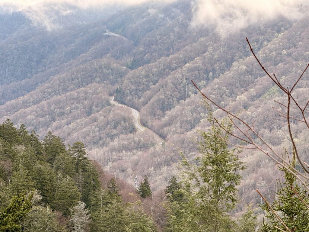 We gaan onderweg en rijden door het mooie landschap van de Great Smoky Mountains. Af en toe zien we een bevroren mini-waterval langs de kant en is het een beetje mistig. Soms werkt de navigatie niet en staat er dat we 3,468 dagen doen over een stuk van 38 mile. Maar dan komen we bij een prachtig uitzichtpunt, namelijk Newfound Gap Overlook. De laaghangende wolken, de kronkelende weg door de bossen, dit is de Great Smoky Mountains!