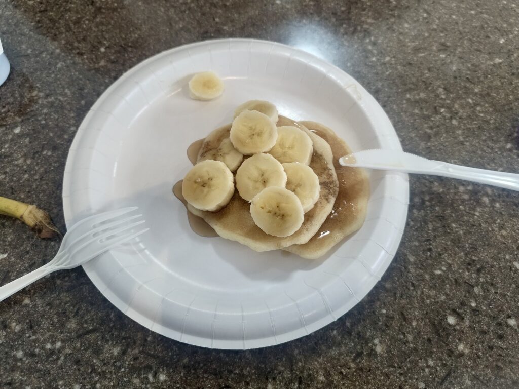 Bij het hotel zit een ontbijt inbegrepen en dus lopen we naar het zaaltje met de bekende Amerikaanse ontbijt-items. Maar hier hebben ze iets leuk, je kunt je eigen pannenkoeken maken. Er staat een machine en zonder ook maar een knop in te drukken, (je moet naar de machine zwaaien om ‘m te activeren) rolt er binnen no-time een pannenkoekje van de lopende band af.