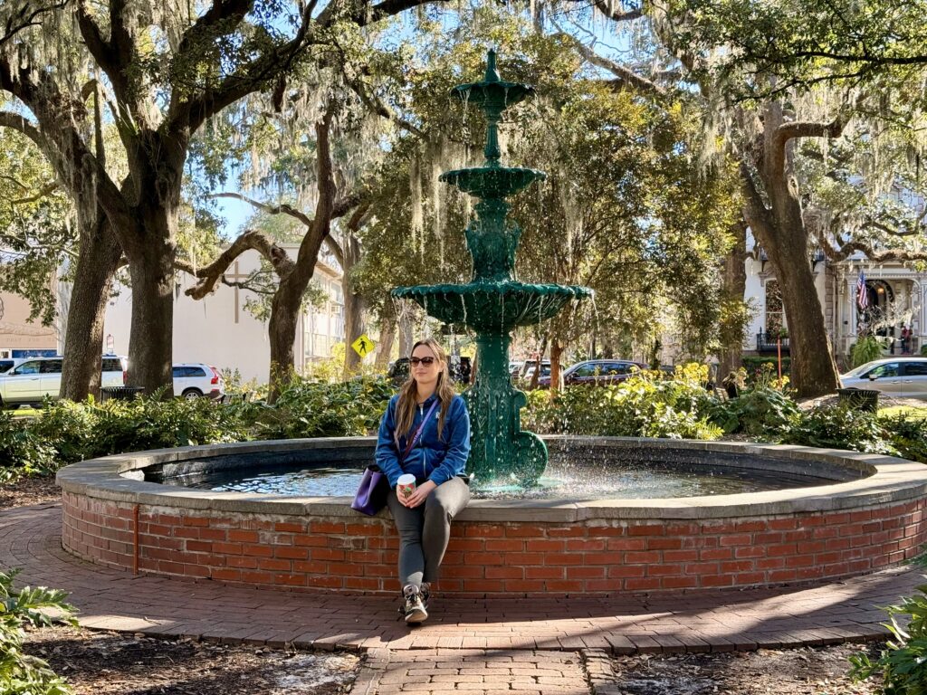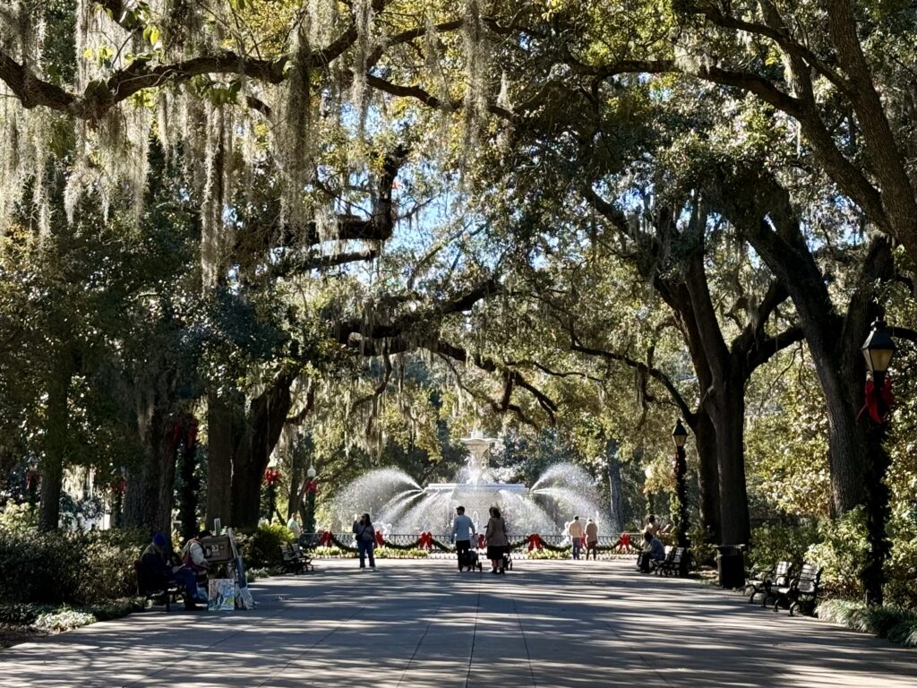 Nadat we langs de meest prachtige huizen zijn gewandeld, komen we uit bij de bekende fontein die je zo vaak ziet als het over Savannah gaat. Die van Forsyth Park. En hij is echt een plaatje! Langs de grote laan die omzoomd wordt met bomen, staan ook kraampjes waar kunstenaars leuke spullen verkopen zoals muntjes van over de hele wereld die tot sieraden zijn verwerkt, maar ook schilderijen en ander handwerk.