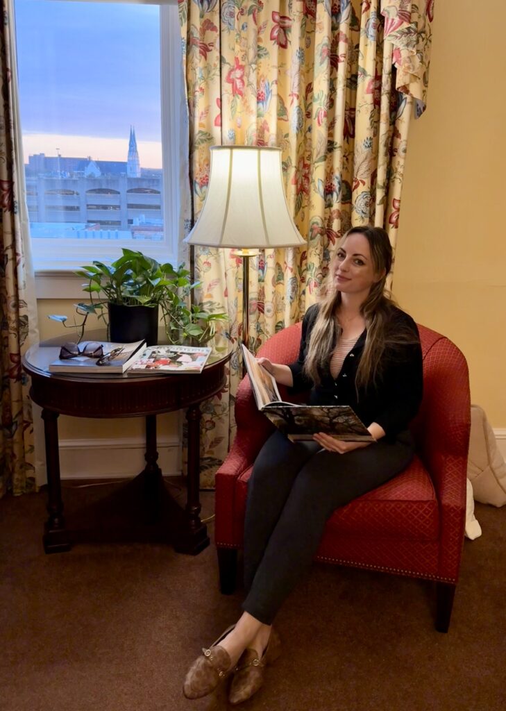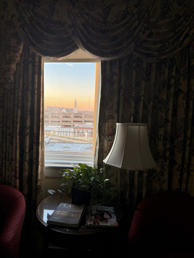 De grote kamer van het historische hotel Planters Inn heeft uitzicht op wat kerktorentjes van Savannah. Met de opkomende zon krijgt de lucht mooie kleuren en het belooft een fijne warme dag te worden.