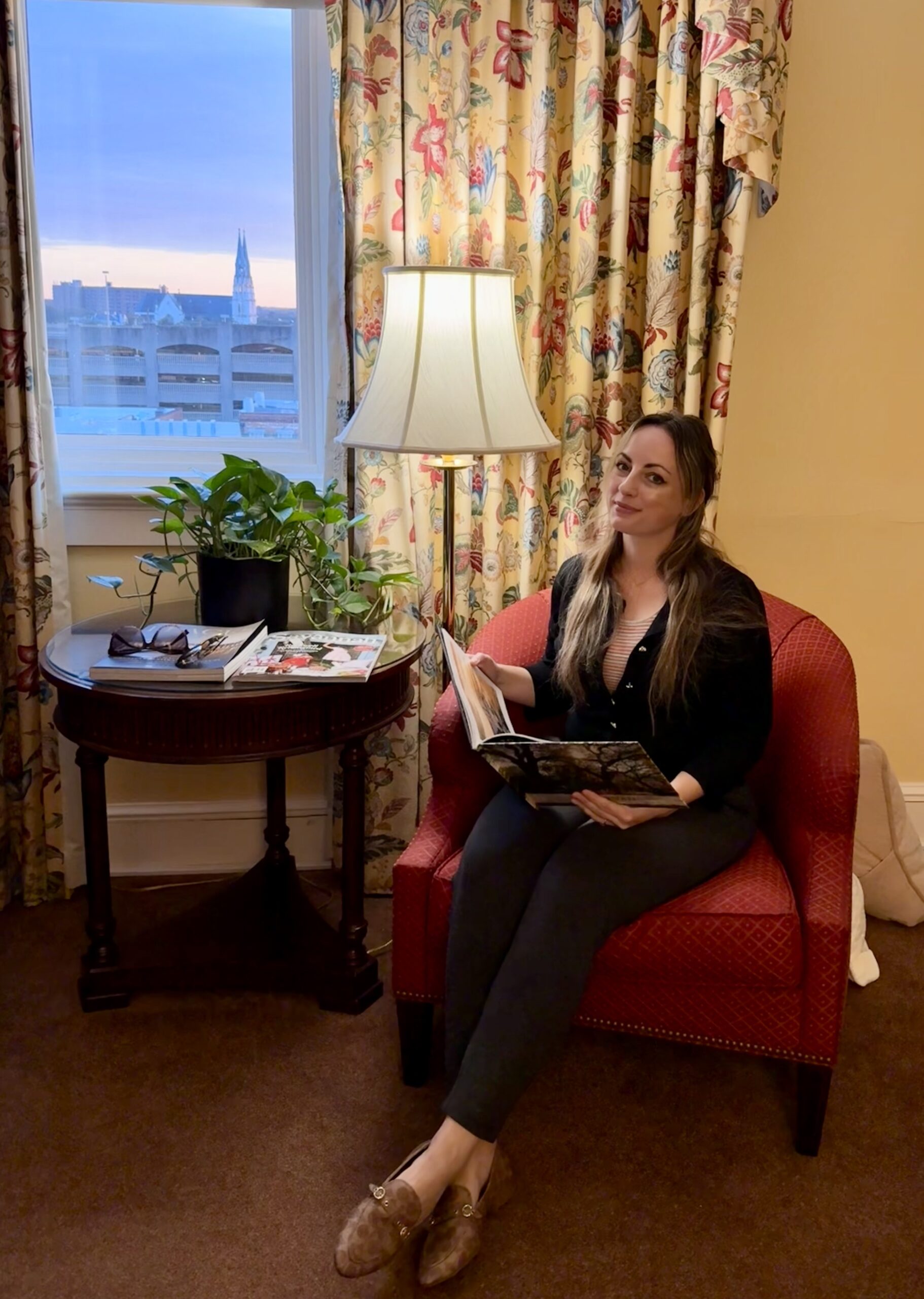 De grote kamer van het historische hotel Planters Inn heeft uitzicht op wat kerktorentjes van Savannah. Met de opkomende zon krijgt de lucht mooie kleuren en het belooft een fijne warme dag te worden.