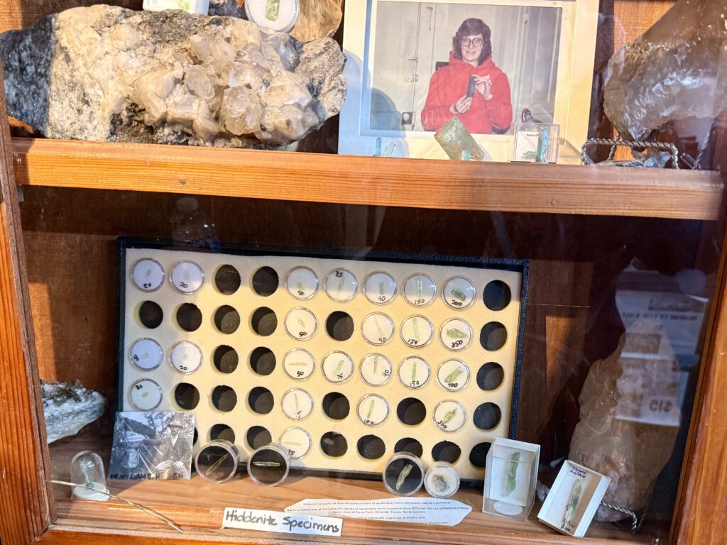 Naderhand vertelt de eigenaar wat voor stenen je gevonden hebt. Die mag je dan allemaal meenemen. Er zit ook een winkeltje bij waar ze zelf sieraden maken van de gevonden edelsteentjes. Hier zie je ook de zeldzaamste steen waar deze plek naar vernoemd is, de Hiddenite. Daar hebben ze afgelopen jaar slechts 5 kleine stukjes van gevonden.