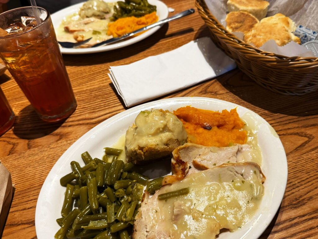 We gaan weer verder en het is anderhalf uur rijden voor de volgende tussenstop: Cracker Barrel! Bij Cracker Barrel is het druk! Omdat het vandaag Thanksgiving is, heb je niets te kiezen. Eten wat de pot schaft dus.