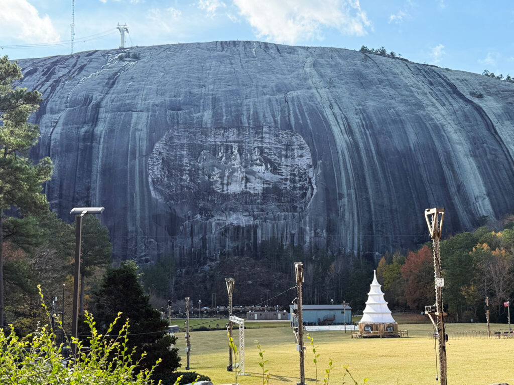 Dan rijden we verder naar de plek waar je de sculptuur in de rots kunt zien. Eerst stonden we bovenop deze enorme rots en nu bewonderen de rots uitsnede. De Confederate Memorial Carving. De afgebeelde personen zijn president Jefferson Davis en generalen Robert E. Lee and Thomas J. “Stonewall” Jackson. Dit is trouwens de grootste hoogreliëf sculptuur ter wereld.
