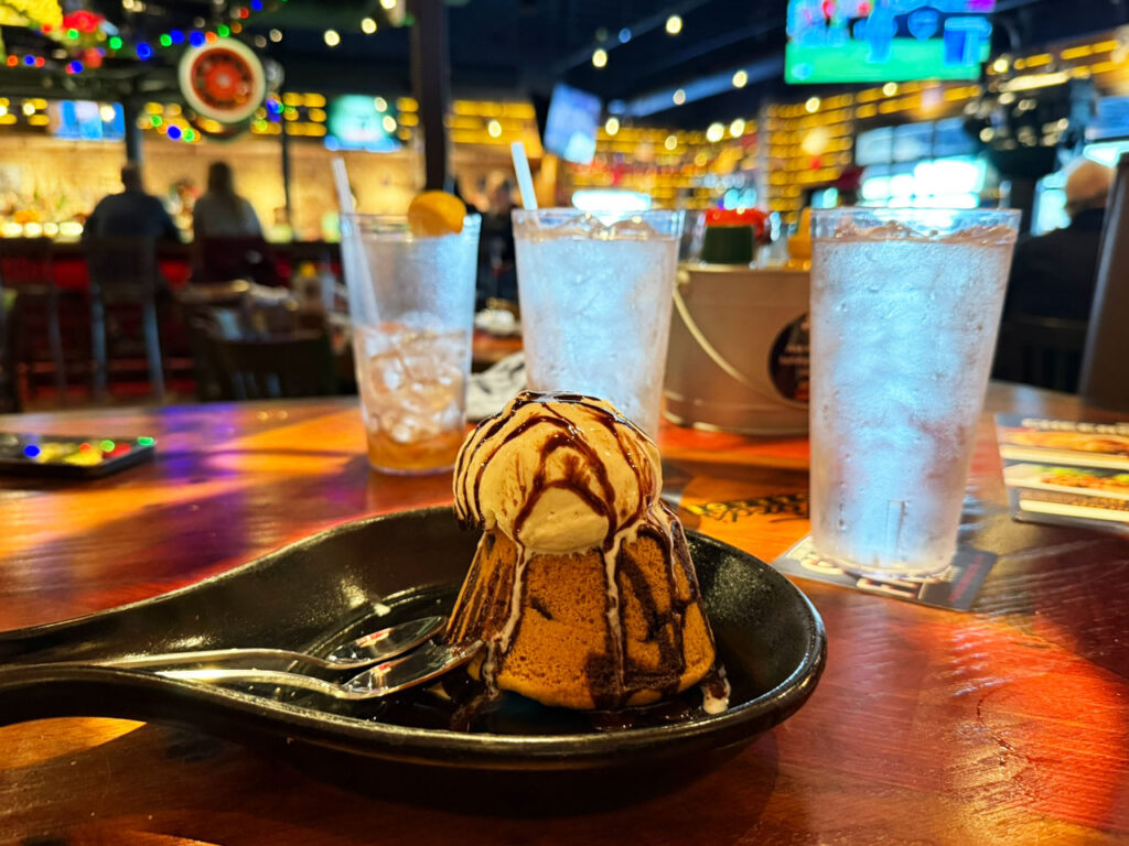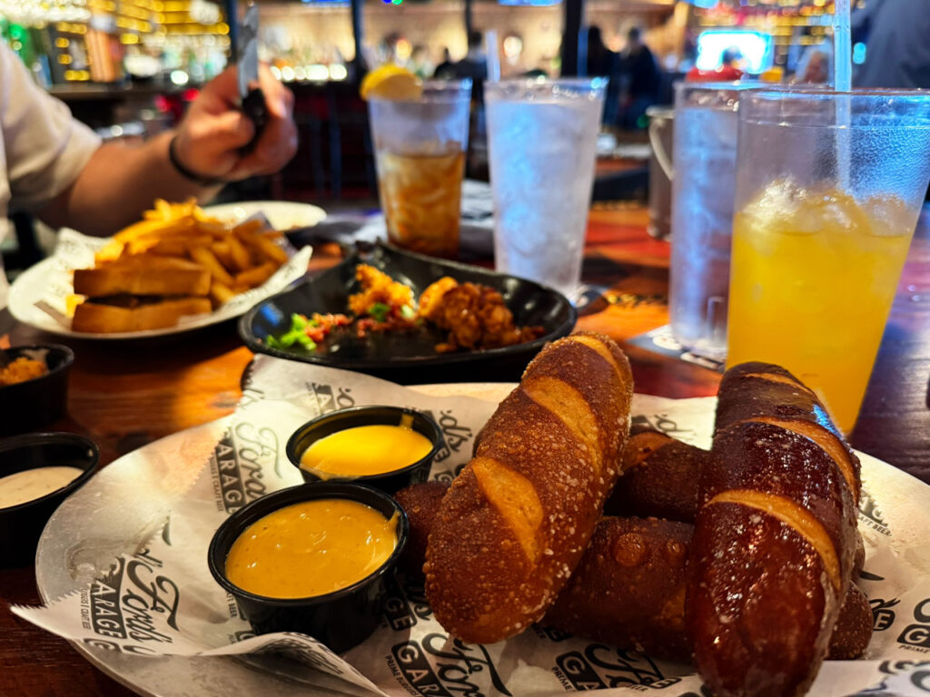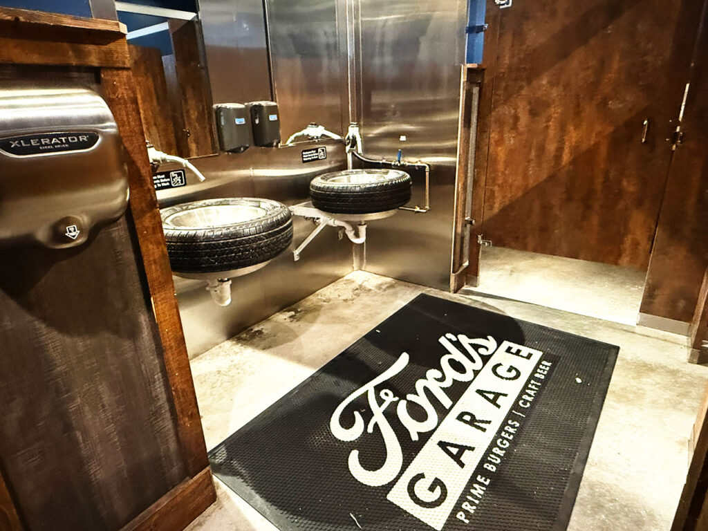 Het is best lastig kiezen, want ze hebben veel keuze. Ik neem de Edsel’s pretzels met sausjes, namelijk een biersaus en honing-mosterdsaus. We delen de sweet & smokey chicken bites, en vragen hier natuurlijk wat ranch saus bij. En als toetje delen we de molten lava cakie. Het is superlekker allemaal en de inrichting is helemaal in stijl van Ford. Zo zie je in de toiletten wel een hele bijzondere wasbak en overal vind je verwijzingen naar garages en auto’s.