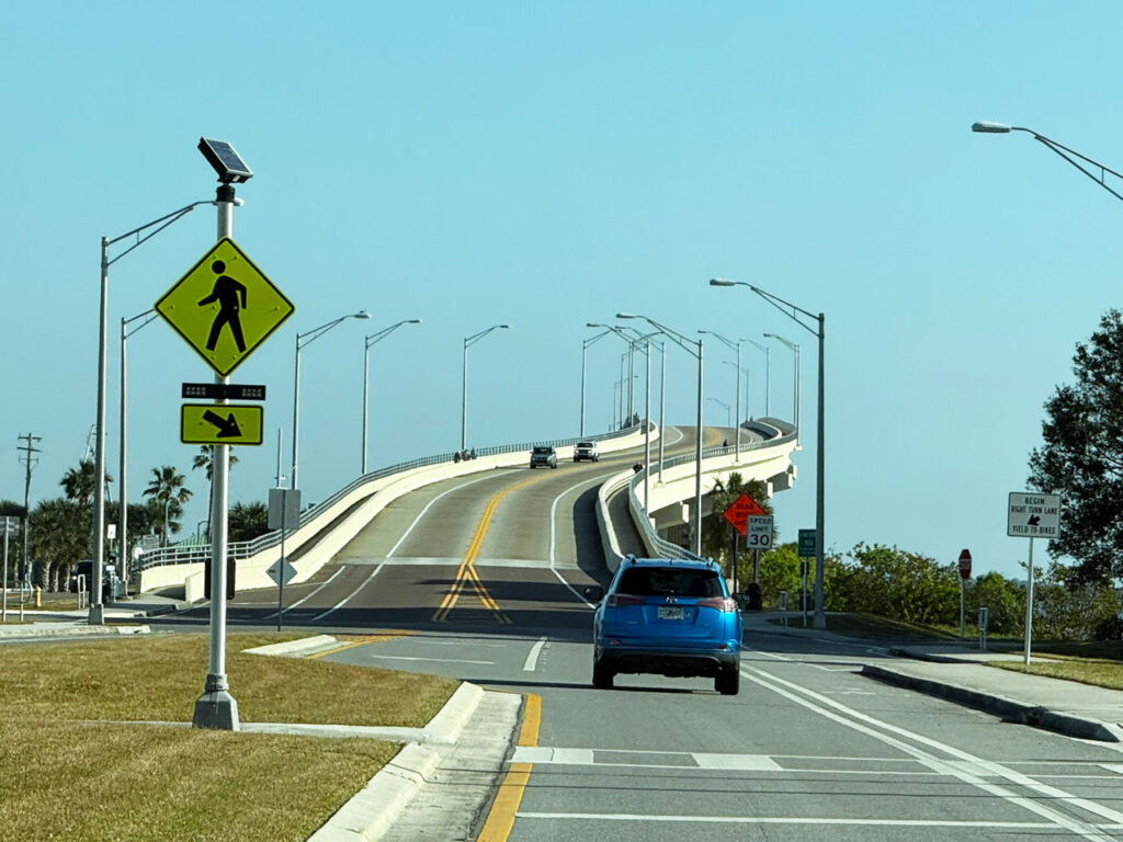 We lopen de brug op en gaan lekker in het zonnetje staan. Hiervandaan zou je het beste uitzicht hebben op de raketlancering vanaf het Kennedy Space Centre. Of je moet kaartjes hebben om bij de speciale tribune van het Kennedy Space Centre te kunnen kijken.